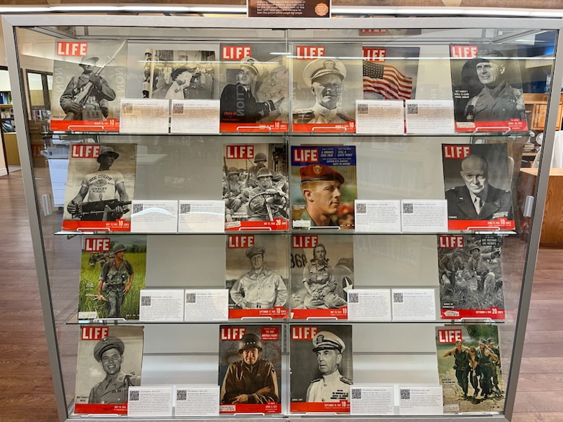 Robinson Public Library is pleased to announce that we have something new for our visitors! We recently installed two, six-foot long glass display cases and filled them with treasures from days long gone by. We have filled each case with vintage magazines. Currently both sides are filled with LIFE Magazines and Time Magazines of military figures from the 20th century, in celebration of Veterans Day. Next to each cover is a brief summary of the person or event depicted. If you are interested in learning more about the contents of the particular edition, you can click on the QR code located next to the text with your phone, or iPad, camera to see the publication page-by-page. The display will change from time-to-time so that we can share different subject matter, from different points in time, with our visitors. Come in and check them out!