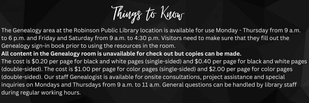 Explore your family history with the premier collection of U.S. obituaries and death notices for in-depth genealogical research from 1704 – today. This one-of-a-kind collection helps patrons and family historians uncover new family members and understand family relationships on a deeper level than ever before. Includes deep coverage from all 50 states, hard-to-find content from the mid 1900’s, and original obituary images. No library card needed when accessing via one of the library district’s public computers and remotely 24/7 for card holders of the Robinson Public Library District. Click the picture to get started.
